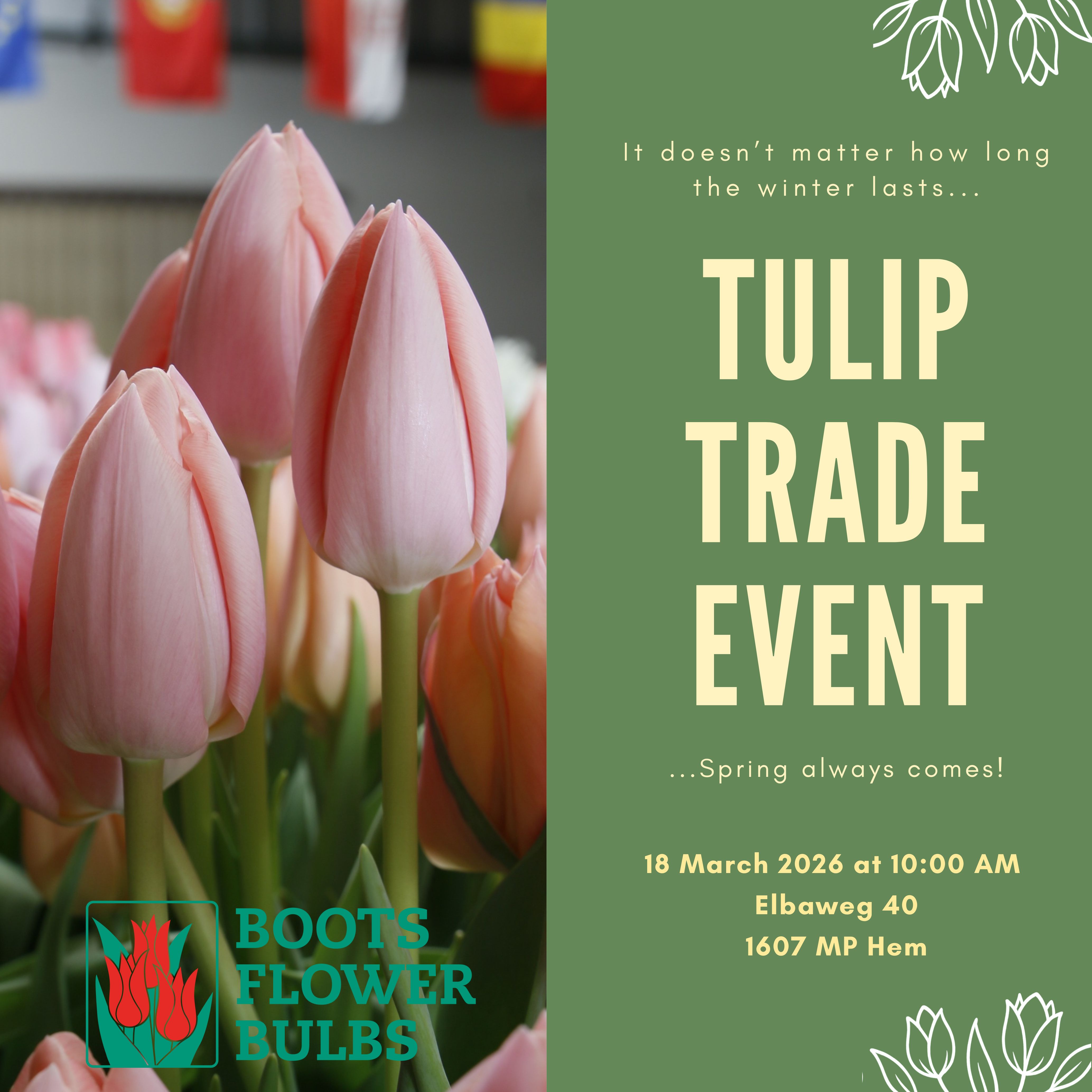 You are very welcome to join us at the Grand Opening of the Tulip Trade Event on Wednesday, March 18 at 10:00 AM at our company, Boots Flowerbulbs, located in Hem.